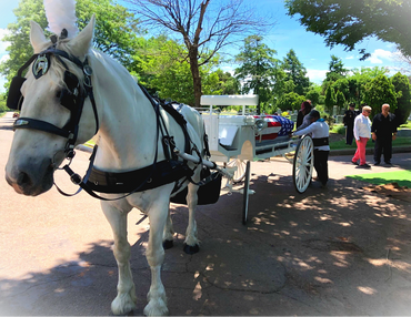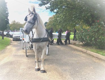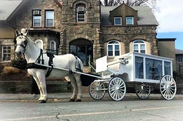Our Authentic Horse Drawn Hearse is pulled by a beautiful well mannered white horse.